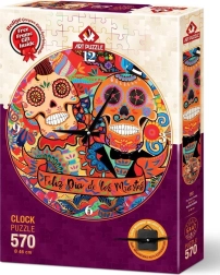 - Kompletne opakowanie: okrągłe puzzle 570 elementów, płyta podkładowa, mechanizm zegarowy z akcesoriami, 4 części ramy i 8 spinaczy łączących.