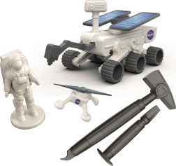 asteroida, części roveru, części drona, kosmonauta, naklejki, próbka skały, młotek, dłuto