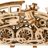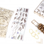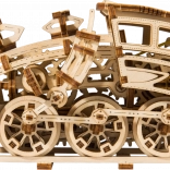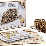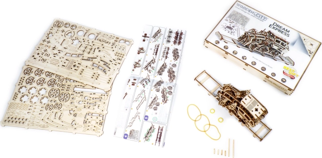 Model Ekspres Marzeń wyposażony jest w koła napędowe i umożliwia ruch do przodu, do tyłu oraz w kółko. Osiąga dystans do 3 metrów przy pełnym naciągnięciu gumkowego silnika. To świetny sposób, by zarówno dzieci, jak i dorośli poznali zasady mechaniki i rozwijali zręczność podczas składania. W zestawie znajduje się ilustrowana instrukcja ułatwiająca montaż modelu.