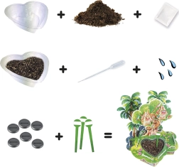 Elementy dekoracji, doniczka w kształcie serca, pipeta, paczka ziemi, koperta z nasionami oraz czytelna instrukcja. Wystarczy złożyć, wysiać i regularnie podlewać.