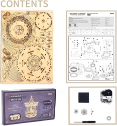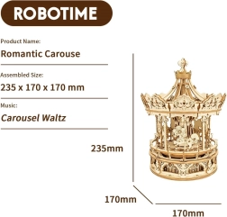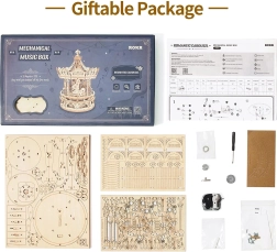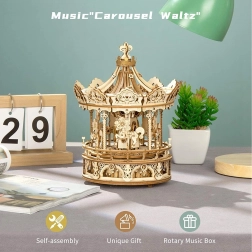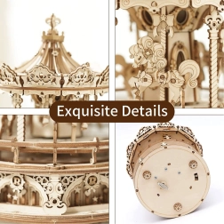 Po złożeniu, karuzela ozdobi twoją półkę, a jej szczegółowe wykonanie cię zachwyci. Dla umilenia chwili podczas jej składania posłuży romantyczna melodia, którą można odtworzyć dzięki wysokiej jakości 18-tonowemu mechanizmowi wykonanemu z japońskich komponentów.
