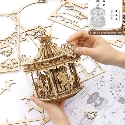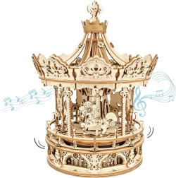 Ciesz się chwilą spokoju i relaksu z drewnianą karuzelą z naszej oferty modeli. Ta karuzela działa nie tylko jako piękna ozdoba, ale też jako wyzwanie dla zręcznych rąk dzięki średniemu poziomowi trudności składania tego 384-elementowego modelu.