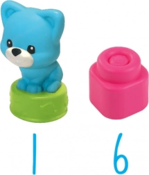 - 6 miękkich klocków, 1 figurka kotki, 1 plastikowe wiaderko/pudełko z pokrywką
