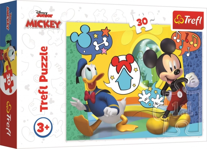 Odkryj świat zabawy z puzzlami Myszka Miki i Wesoły Domek, które zawierają 30 zróżnicowanych elementów. Po ułożeniu powstaje efektowny obraz o wymiarach 27x20 cm, który ucieszy każdego fana Myszki Miki.