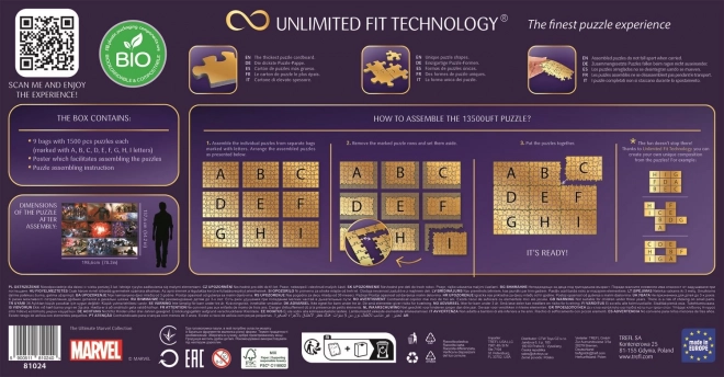 Zachwycająca układanka przedstawiająca przygody bohaterów Marvel Universe. Każdy obrazek jest pakowany oddzielnie (9x1500 elementów). Dzięki technologii TREFL Unlimited Fit Technology (UFT), która umożliwia łączenie poszczególnych obrazków ze sobą, możesz stworzyć dowolną kompozycję ilustracji lub trzymać się układu zgodnego z wzorem.