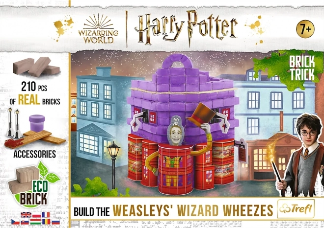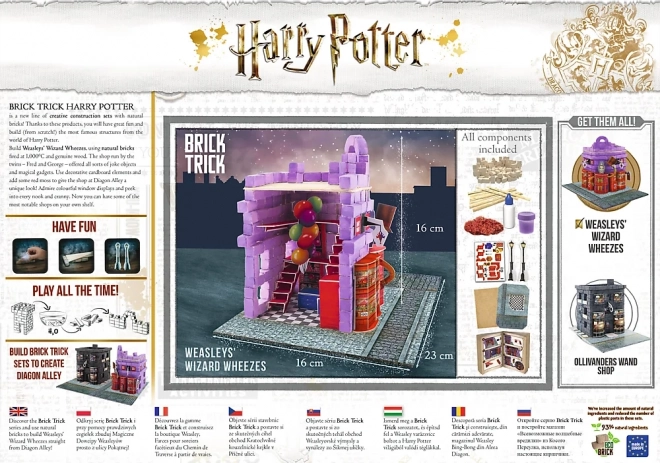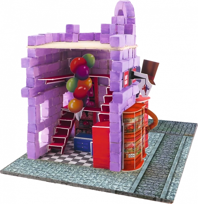 Stwórz w domu magiczny kącik z barwnym sklepem bliźniaków Freda i George’a. Zestaw Brick Trick łączy prawdziwe materiały – mini cegiełki i drewniane listewki – z dekoracjami, które nadają budowli charakter. Krok po kroku wzniesiesz budynek od podstaw aż po gotowy model, a na końcu ozdobisz go dołączonymi elementami.