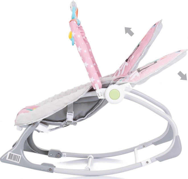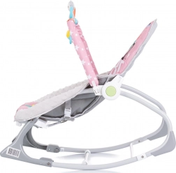 CHIPOLINO Baby Spa to praktyczny leżaczek, który rośnie razem z Twoim maluszkiem. Dzięki funkcji 2w1 najpierw służy jako bujaczek dla noworodka (do 9 kg), a później jako krzesełko dla samodzielnie siedzących dzieci (do 18 kg). Delikatne wibracje i melodie koją i pomagają dziecku odpocząć, a pałąk z zawieszanymi zabawkami wspiera rozwój koordynacji wzrokowo‑ruchowej.