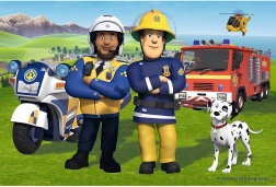 Odkryj zabawę i kreatywność z dwustronnymi puzzlami, które przedstawiają zespół Strażaka Sama i są idealne dla dzieci od 3 lat.