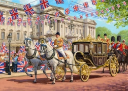 Złota kareta, uroczyste mundury i flagi nadają motywowi królewskiej elegancji. Idealne dla miłośników tradycji i historii.