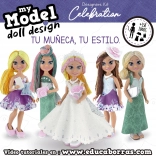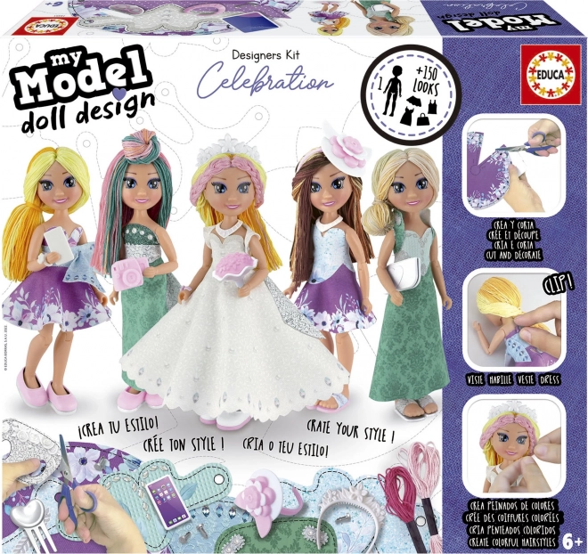 Opakowanie zawiera: składana lalka, tkanina z nadrukowanymi szablonami 61x32 cm, akcesoria modowe, włóczka na włosy, dziurkacz do odzieży, akcesoria, ilustrowana instrukcja. Kreatywne zestawy My Model Doll Design są podzielone według 6 różnych tematów: Atelier mody, Świętowanie, Gwiazda pop, Glam Chic, Świat fantazji i Styl codzienny.