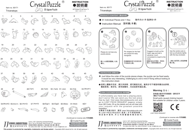 Puzzle 3D Triceratops z młodym oferują oryginalną rozrywkę dla wszystkich grup wiekowych. Każdy z 61 elementów został starannie zaprojektowany dla łatwego składania, a efektem jest szczegółowy i estetyczny model. Bez podpowiedzi układanka staje się prawdziwym wyzwaniem, ale instrukcja gwarantuje łatwe zachowanie właściwej kolejności kroków.