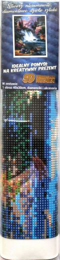 Zawartość opakowania: płótno z nadrukowanym obrazem, pisak do aplikacji kamyczków, tacka do wysypywania kamyczków, wosk do naklejania, zestaw kolorowych kamyczków.