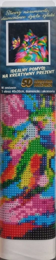 Zawartość opakowania: płótno z nadrukowanym obrazem, aplikator do kamyczków, tacka do wysypywania kamyczków, wosk do przyklejania, zestaw kolorowych kamyczków.