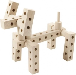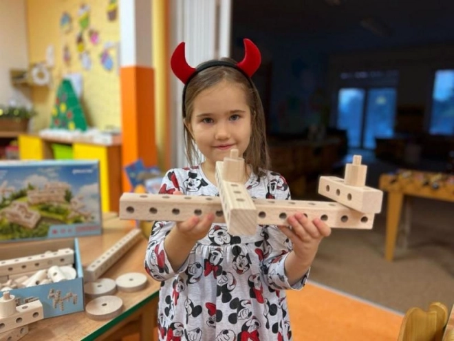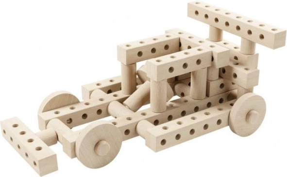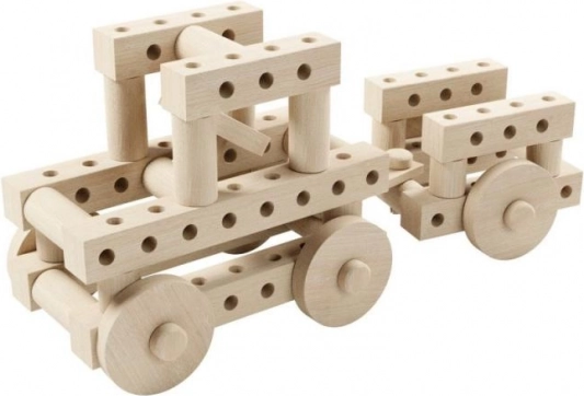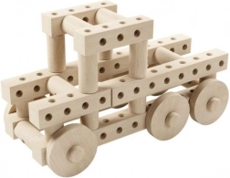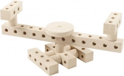 Zawiera bukowe wałeczki o średnicy 32 mm, klocki i kółka z otworami, które wspierają nieograniczoną kreatywność i rozwój motoryki małej.