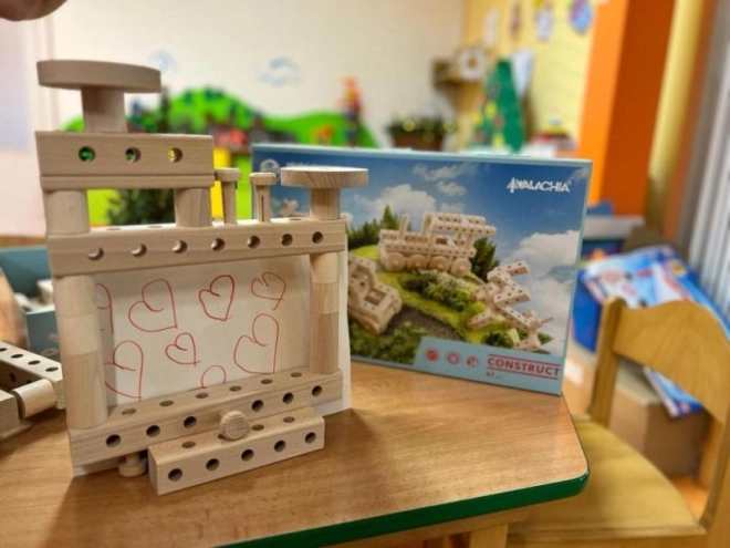 Odkryj świat kreatywności z naszym podstawowym zestawem konstrukcyjnym zawierającym 67 drewnianych elementów. Te części, w tym wałeczki i klocki, umożliwiają budowę różnorodnych środków transportu, zwierząt i innych modeli. Wszystko w solidnym kartonowym pudełku, które długotrwale chroni Twoje zabawki.