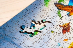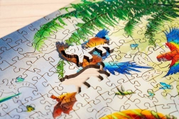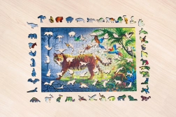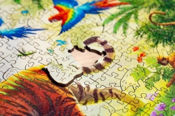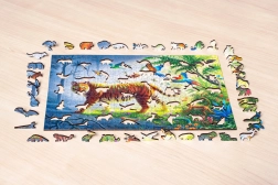 Drewniane puzzle Tygr w dżungli łączą precyzyjną europejską produkcję z urzekającym motywem. Każdy element jest oryginalny – znajdziesz wśród nich kształty zwierząt, kwiatów i innych przedmiotów, które czynią układanie jeszcze bardziej wciągającym i wizualnie atrakcyjnym. Dzięki wytrzymałości materiału i precyzyjnemu wycięciu puzzle świetnie trzymają się razem, a wielokrotne układanie im nie szkodzi.