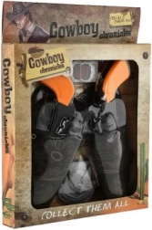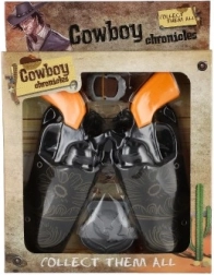 Dwa stylowe rewolwery z pomarańczową rękojeścią i czarną lufą zapewniają autentyczne westernowe wrażenia przy każdej wymyślonej potyczce.