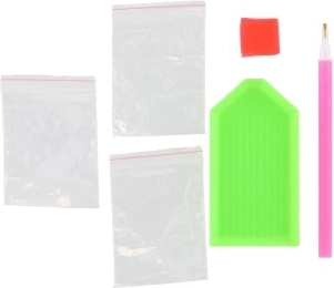 Płótno z nadrukowanym obrazkiem, długopis do aplikacji kamyczków, miseczka, wosk oraz zestaw kolorowych kamyczków.