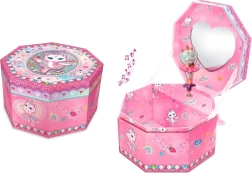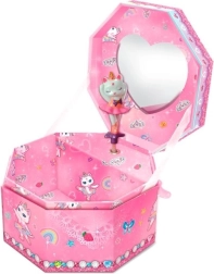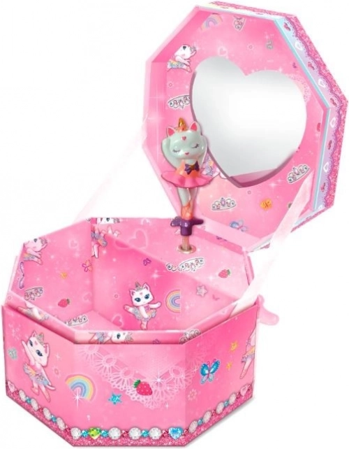 Czarująca ośmiokątna pozytywka-szkatułka z motywem kotki baletnicy ucieszy każde dziecko. Po otwarciu figurka zaczyna się obracać, a rozbrzmiewa klasyczna melodia. Szkatułka ma lusterko, miejsce na drobiazgi i działa na mechaniczne nakręcanie, bez baterii.