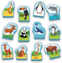 Dzieci dopasowują magnetyczne elementy kontynentów i zwierzątka do odpowiednich obszarów, utrwalając wiedzę z geografii i fauny.