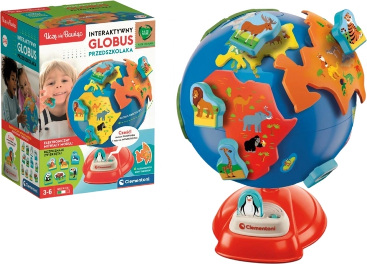 - Obrotowy globus do złożenia, interaktywny moduł mówiący, 6 kontynentów, 14 zwierząt, instrukcja