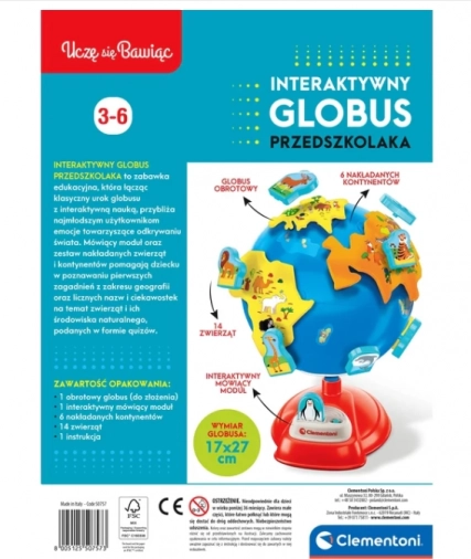 - Zawartość opakowania: obrotowy globus (do złożenia), mówiący interaktywny moduł, 6 nakładanych kontynentów, 14 zwierzątek, instrukcja