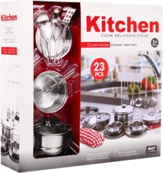 Ten 23‑elementowy zestaw kuchenny dla dzieci oferuje świetną okazję do kreatywnych zabaw w odgrywanie ról. Zestaw zawiera prawdziwe metalowe naczynia oraz tekstylny kostium szefa kuchni, który wspiera wyobraźnię i rozwój praktycznych umiejętności. Odpowiedni dla dzieci od 3 lat i gwarantuje godziny zabawy.