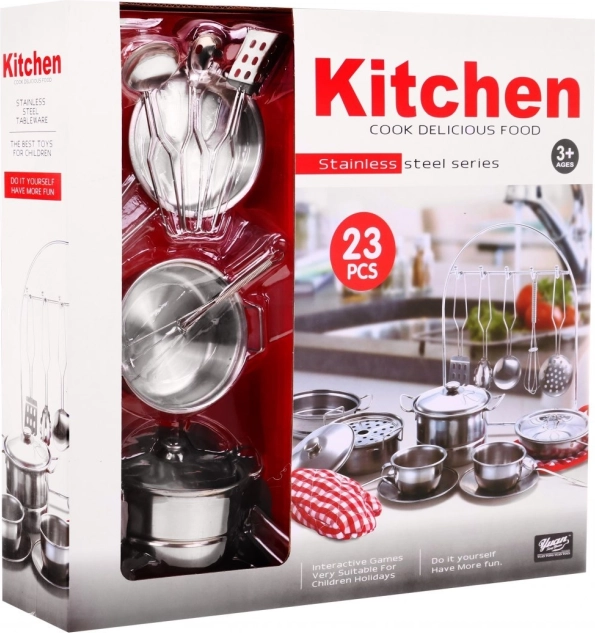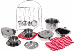 Ten zestaw zawiera różne metalowe garnki, patelnie i naczynia dla autentycznych wrażeń z zabawy. Dziecko może cieszyć się zabawą z realistycznie wyglądającymi akcesoriami kuchennymi.