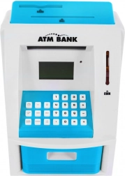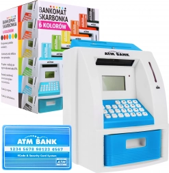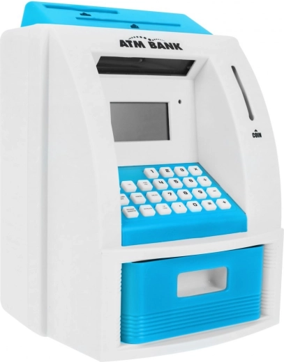 Zabawna i edukacyjna skarbonka w formie bankomatu dla dzieci od 3 lat z polskimi nominałami PLN, działająca na PIN i z dołączoną kartą. Uczy dzieci zarządzać pieniędzmi, planować oszczędności i śledzić stan konta. Posiada funkcje takie jak automatyczne liczenie monet i banknotów, ustawianie celu oszczędności, blokada na PIN, zegar i kalkulator.