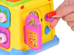 Po jednej stronie umieszczono cztery wyraziste buźki w kolorowych ramkach jak kartki książki, po drugiej cztery zębate koła z korbką do kręcenia. Z tyłu znajdziesz drzwiczki z dzwoneczkiem i zmiennymi obrazkami sterowanymi kluczykiem. Zabawka wspiera rozwój umiejętności manualno-ruchowych, naukę kolorów i kształtów oraz rozróżnianie dźwięków. Świetna na prezent – dostarczana w atrakcyjnym kolorowym pudełku.