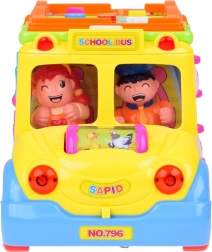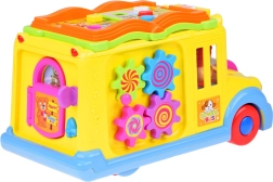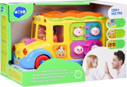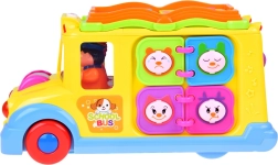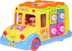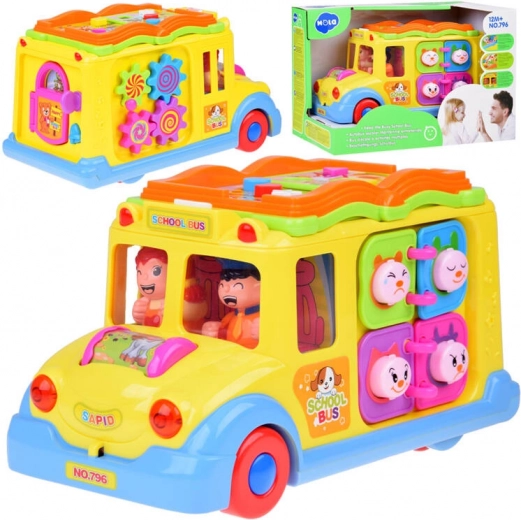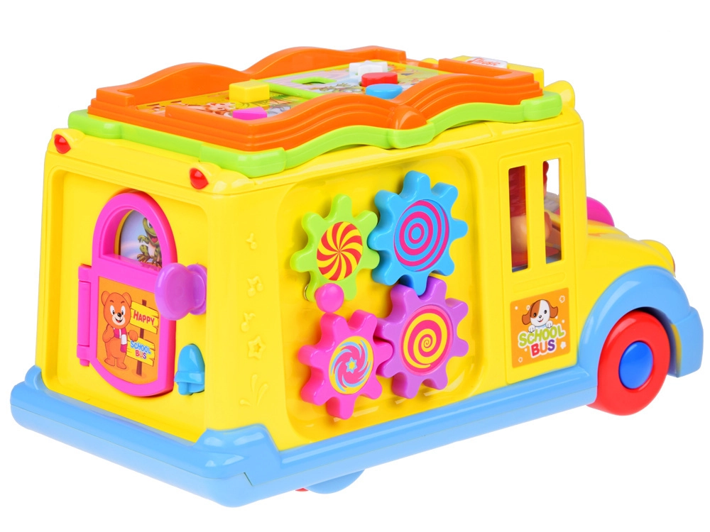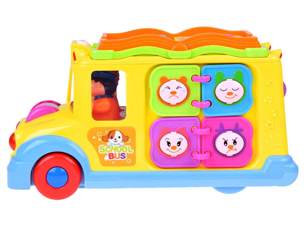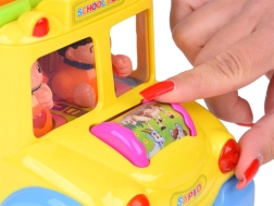 Interaktywny autobus szkolny zachwyca żywymi kolorami, starannym wykonaniem i wieloma funkcjami. Podczas jazdy gra radosna muzyka i migają przednie światła. Po zderzeniu z przeszkodą automatycznie zmienia kierunek, można nim także sterować ręcznie. Przedni obrotowy wałeczek ze zwierzątkami po przekręceniu uruchamia śmiech dziecka i krótkie melodie. Na dachu znajduje się kolorowa książeczka z przyciskami – każdy przycisk aktywuje dźwięki zwierzątek, klakson, rozruch silnika lub melodie.