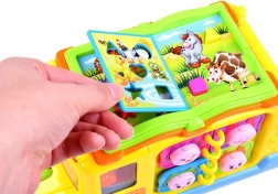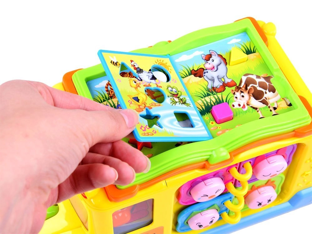 Przyciski o różnych kształtach i kolorach, obrotowy wałeczek ze zwierzątkami, zębate koła z korbką, drzwiczki z dzwoneczkiem, tylny kluczyk do zmiany obrazków