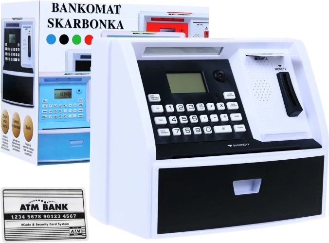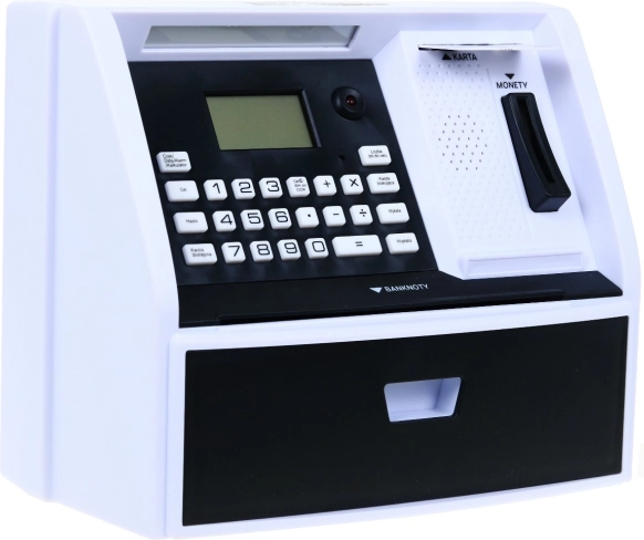 Interaktywna skarbonka w kształcie bankomatu z kartą i PIN-em uczy dzieci mądrego gospodarowania pieniędzmi. Wspiera polskie nominały PLN, ma liczenie monet, cel oszczędzania, zegar i budzik oraz możliwość wplaty i wypłaty. Świetny edukacyjny prezent dla małych oszczędzających.