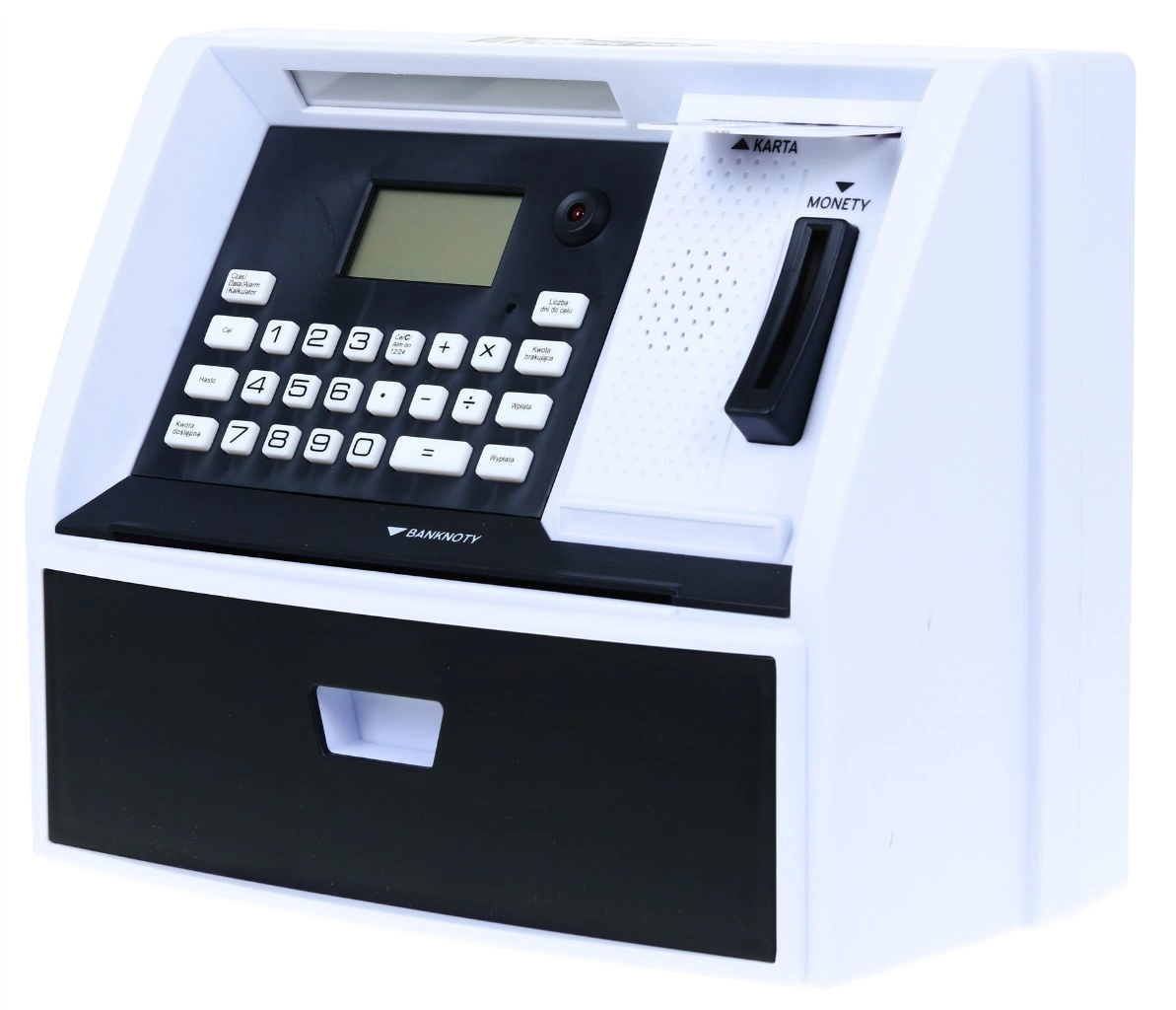 - Wpłata i wypłata, karta i PIN, liczenie monet PLN, ustawienie celu oszczędzania, zegar i budzik