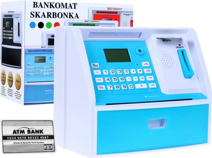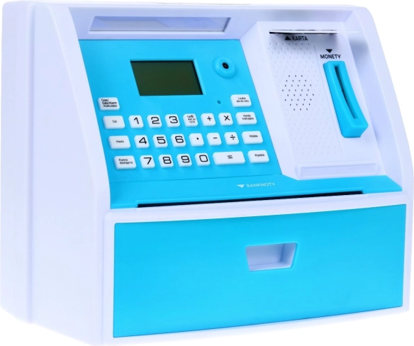 Interaktywna dziecięca skarbonka w kształcie bankomatu uczy dzieci w zabawny sposób, jak oszczędzać i obchodzić się z pieniędzmi. Zawiera kartę bankową, blokadę PIN oraz automatyczne rozpoznawanie polskich monet. Dzięki zliczaniu oszczędności w PLN, ustawianiu celu oszczędzania i wyświetlaniu czasu z budzikiem staje się świetną zabawką edukacyjną i praktyczną pomocą w codziennym oszczędzaniu.