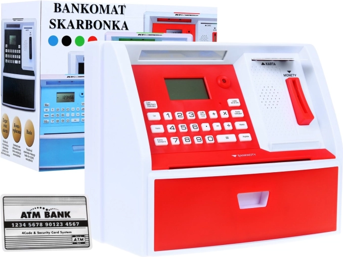 Ta zabawna i edukacyjna skarbonka w formie bankomatu uczy dzieci, jak działa wypłata gotówki i oszczędzanie. Wystarczy włożyć kartę, wprowadzić PIN i wybrać żądaną operację. Automatycznie rozpoznaje wrzucone monety i dolicza je do zgromadzonej kwoty, dzięki czemu dzieci widzą, jak rosną ich oszczędności.