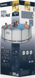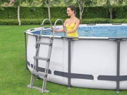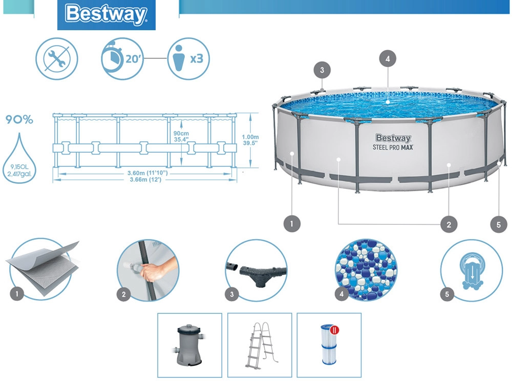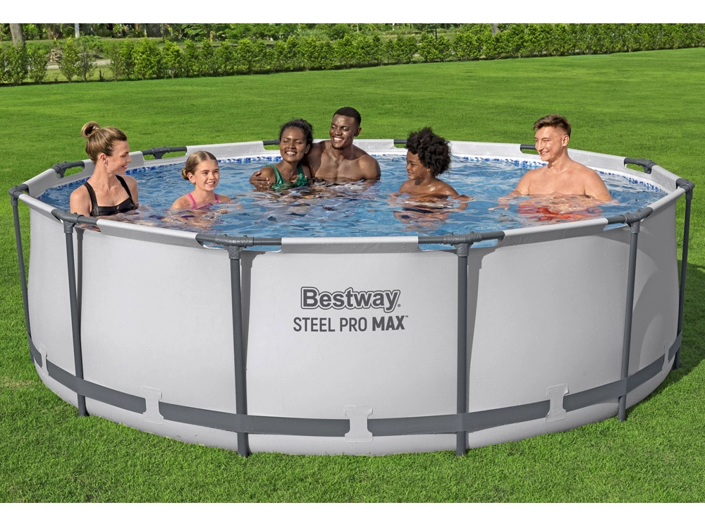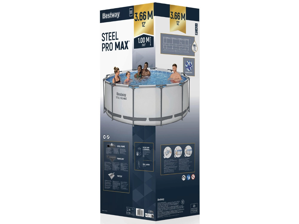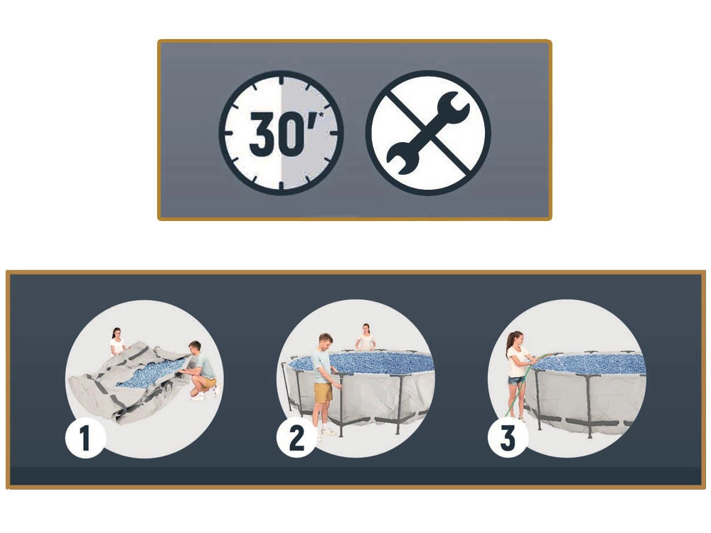 Solidny, okrągły basen ogrodowy oferuje do 9 150 litrów krystalicznie czystej wody, idealnej na upalne dni. Stalowy stelaż odporny na korozję z inteligentnymi złączami FrameLink System minimalizuje zużycie w miejscach połączeń metalowych. Liner z wielowarstwowego materiału Tritech wzmocniony poliestrowym rdzeniem i dwiema mocnymi warstwami PVC jest wyjątkowo odporny na rozerwanie, przebicia i uderzenia.