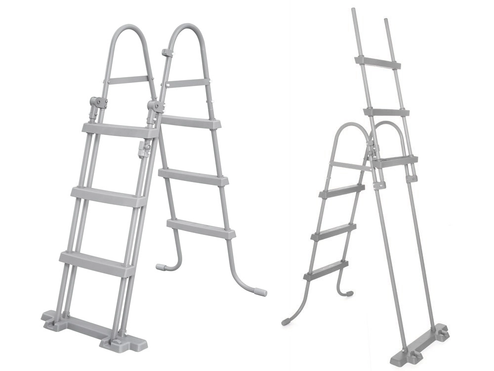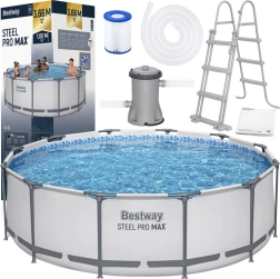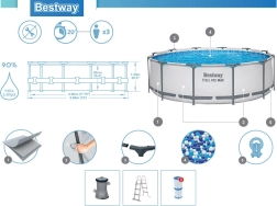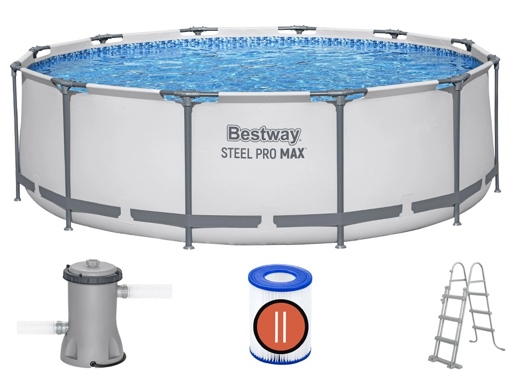 W komplecie znajduje się pompa filtrująca z wkładem typu II, węże i obejmy, sitka, zaślepki, łatka naprawcza oraz bezpieczna, odłączana drabinka.