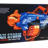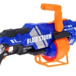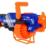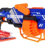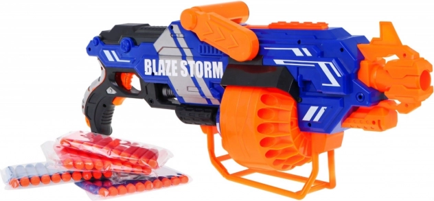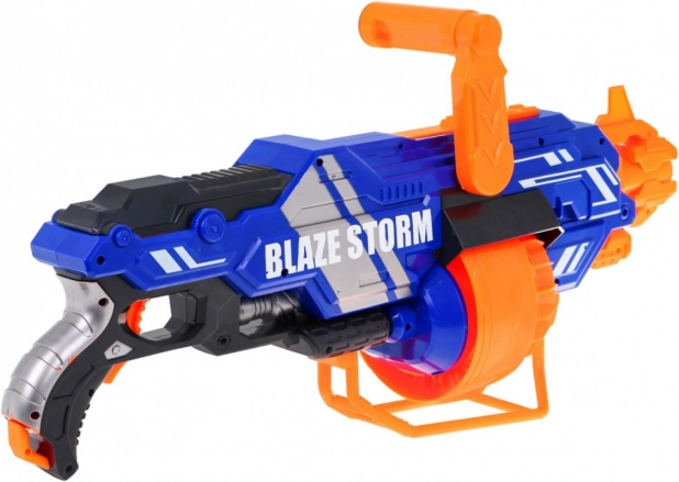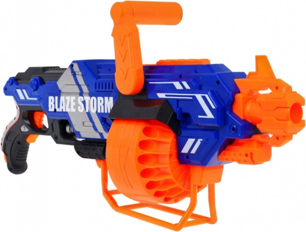 Blaster BLAZE STORM to łatwa w obsłudze zabawka do dynamicznej gry w domu i na zewnątrz. Wystarczy włożyć baterie (8× AA 1,5 V, brak w zestawie), napełnić bęben-magazynek, przytrzymać przycisk zasilania i nacisnąć spust. Możesz wybrać pojedyncze strzały lub ciągłą serię w zależności od czasu trzymania spustu.