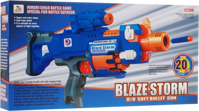Ciesz się dynamiczną zabawą z elektrycznym pistoletem-blasterem dla dzieci BLAZE STORM, który strzela miękkimi piankowymi nabojami. Oferuje w pełni automatyczne strzelanie, szybkostrzelność do 3 strzałów na sekundę, zasięg około 10 m oraz odpinaną kolbę, dzięki której zamienisz go w kompaktowy pistolet. W zestawie znajduje się nasadka optyczna oraz 20 długich piankowych nabojów do bezpiecznej i wciągającej zabawy od 8 roku życia.