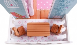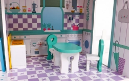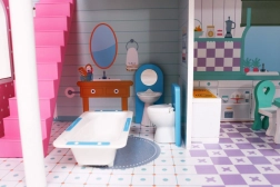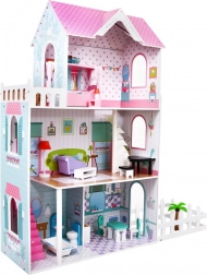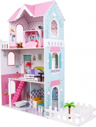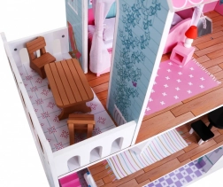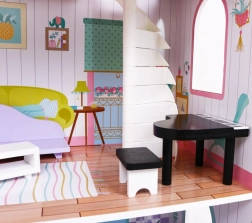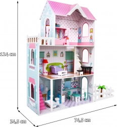 Drewniany domek dla lalek stanowi idealne środowisko zabawowe dla dzieci już od 3 roku życia. Wykonany z wytrzymałego drewna, ten domek jest pokryty bezpiecznymi, nietoksycznymi farbami, które chronią go przed uszkodzeniami. Trzy piętra pełne stylowego wyposażenia, w tym kuchnia, łazienka, salon, sypialnia i taras oferują różnorodne scenariusze zabawowe.