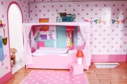 Domek jest wyposażony w realistyczne pokoje z drobiazgowymi dekoracjami i meblami, co zapewnia autentyczne doświadczenia zabawowe.