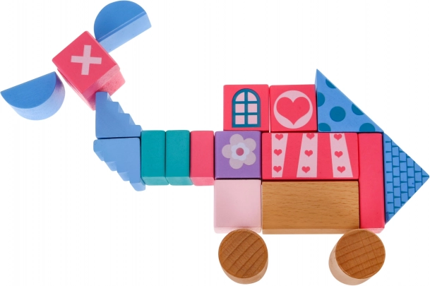 Różne kształty, takie jak walce, prostokąty i trójkąty, pomagają dzieciom rozwijać wyobraźnię przestrzenną i podstawy matematyki.