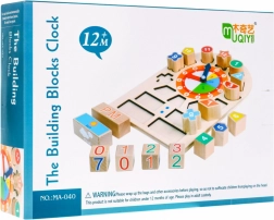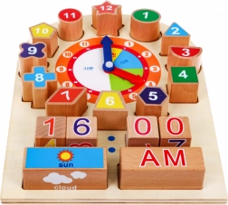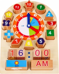 Ten drewniany zestaw zegarowy pomoże Twojemu dziecku łatwo nauczyć się rozpoznawać czas, porę dnia, pogodę i miesiące. Zawiera dwie ruchome wskazówki, które można dowolnie ustawiać na różne godziny. Dziecko może od razu zapisywać czas za pomocą kostek z liczbami, a także rozpoznawać porę dnia oraz to, czy jest słonecznie, pochmurno, deszczowo czy śnieżnie. Kostki z liczbami mają różne kształty, które należy prawidłowo umieścić na tablicy.