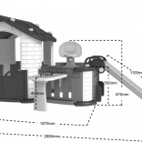 Domek oferuje zjeżdżalnię, kosz do koszykówki, ogródek ze stolikiem i dwoma krzesełkami, co zapewnia dzieciom szerokie możliwości zabawy.