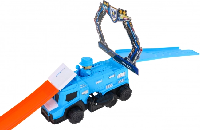 Duża policyjna ciężarówka z wbudowaną wyrzutnią wystrzeli auto do wyścigu w sekundę. Przygotuj się na akcję jak z prawdziwego pościgu!