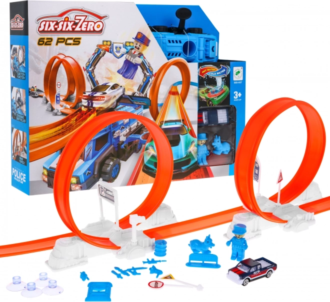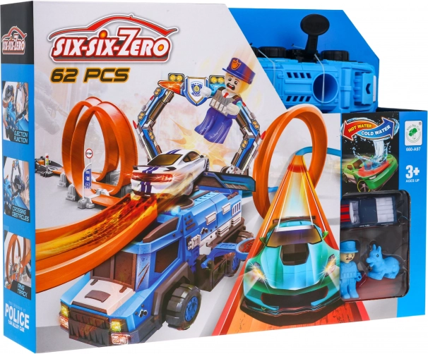 Zbuduj własny tor adrenaliny w policyjnym stylu i puść autka przez dwie duże pętle z pełnym obrotem 360°. Wydajna wyrzutnia zapewnia potrzebną prędkość, a duża policyjna ciężarówka stanie się centrum każdego pościgu. Specjalne autko po zamoczeniu zmienia kolor, więc każdy przejazd przynosi nowe efekty i historie.