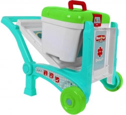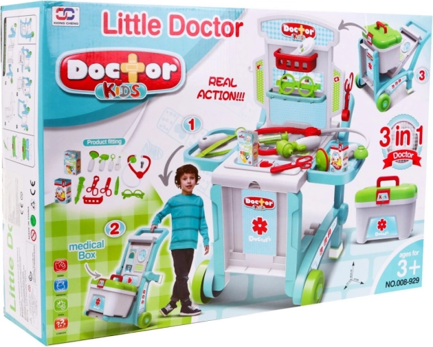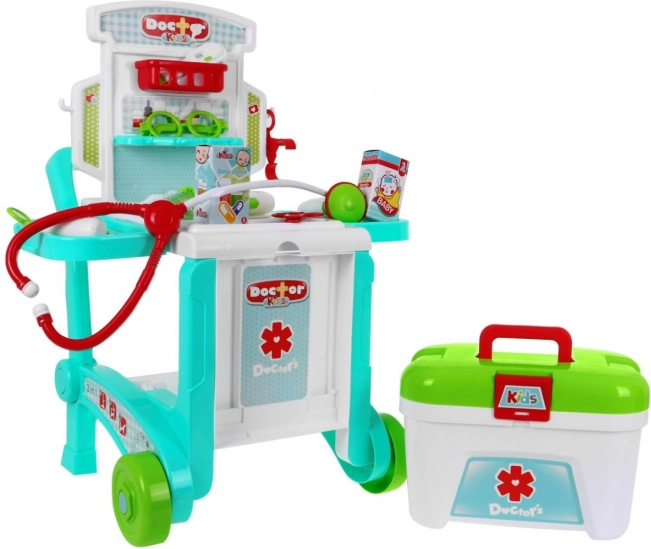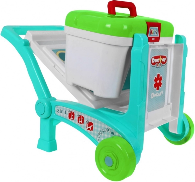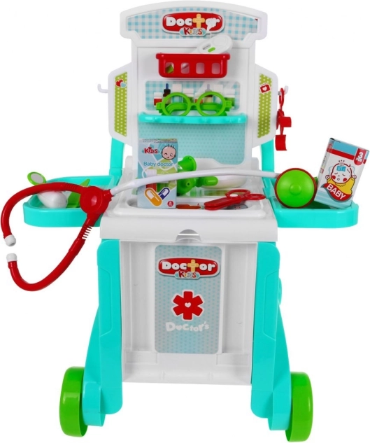 \nTen dziecięcy zestaw lekarski w delikatnych pastelowych kolorach zapewni godziny zabawy i nauki. Stolik na kółkach łatwo zamienisz w dwa różne wózki w zależności od wieku i wzrostu dziecka, a kuferek bezpiecznie pomieści wszystkie narzędzia. Na stoliku znajdują się 2 boczne półeczki na potrzebne akcesoria oraz nadstawka z półkami i haczykami na „leki” i dodatki. Dzięki uchwytowi cały gabinet wygodnie przewieziesz z pokoju do pokoju.