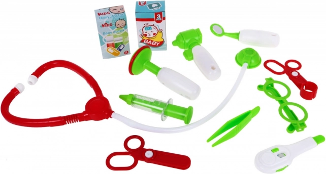 W zestawie jest wszystko, czego mały lekarz potrzebuje: stetoskop, okulary, dwoje nożyczek (także z zaokrągloną końcówką), pęseta, strzykawka, termometr, pudełko z plastrami i kompresami, lusterko do badania, nasadka do badania, młoteczek oraz naklejki. Zabawa pomaga oswoić lęk przed lekarzem, rozwija umiejętności społeczne i wspiera wyobraźnię.