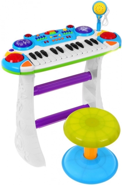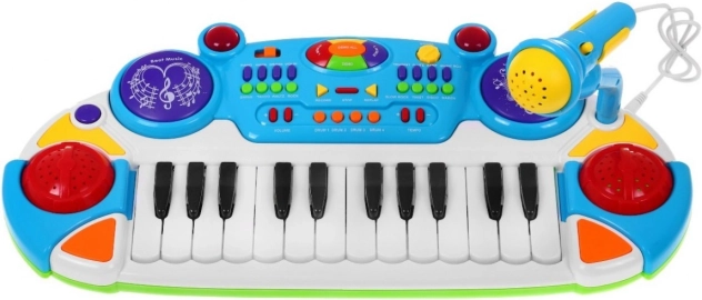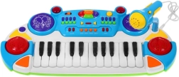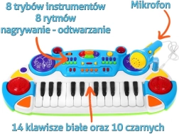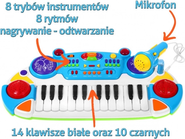 Niebieski zestaw muzyczny to doskonały wybór dla małych miłośników muzyki. Zawiera klawiaturę z dwiema oktawami, mikrofon oraz efektowne światła, co pozwala dzieciom eksperymentować z dźwiękami i światłami podczas zabawy.